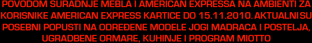 Ormari sa staklenim plohama u koje se mogu umetnuti zidne tapete s uzorkom po želji. Na taj način možete prema vlastitoj želji oslikati velike plohe ugradbenih ormara i sve popratiti jednakim uzorkom tapete na zidu. Istovremeno ćete dobiti potpuno iskoristiv, dobro organiziran te ugodan i lijep životni prostor. Promotivni popust povodom Ambiente iznosi atraktivnih 15% stoga požurite iskoristiti ovu jedinstvenu priliku. Korisnici American Express kartice, povodom suradnje Mebla i PBZ-a na Ambienti, ostvaruju poseban popust od čak 20%. (do 15.11.2010.)